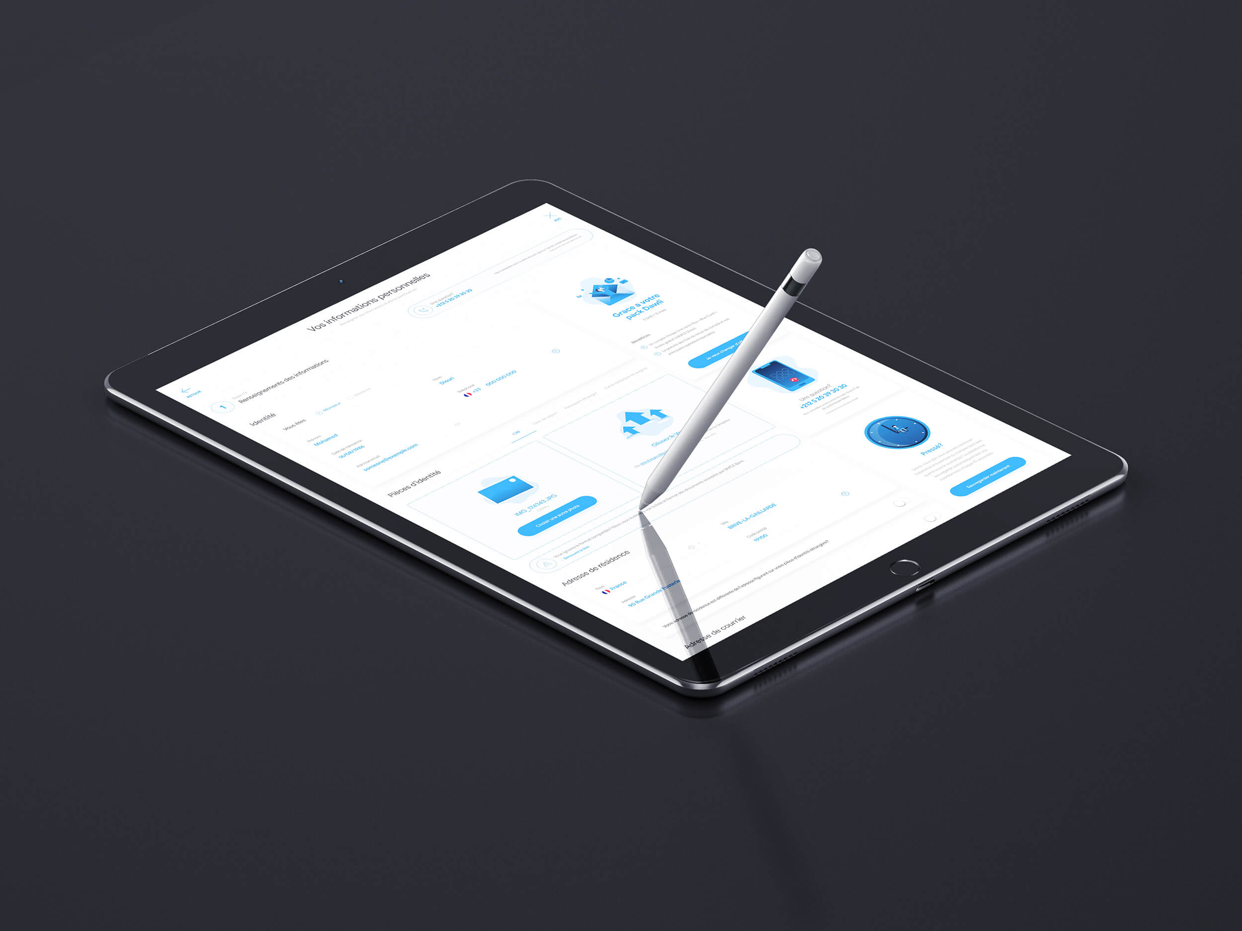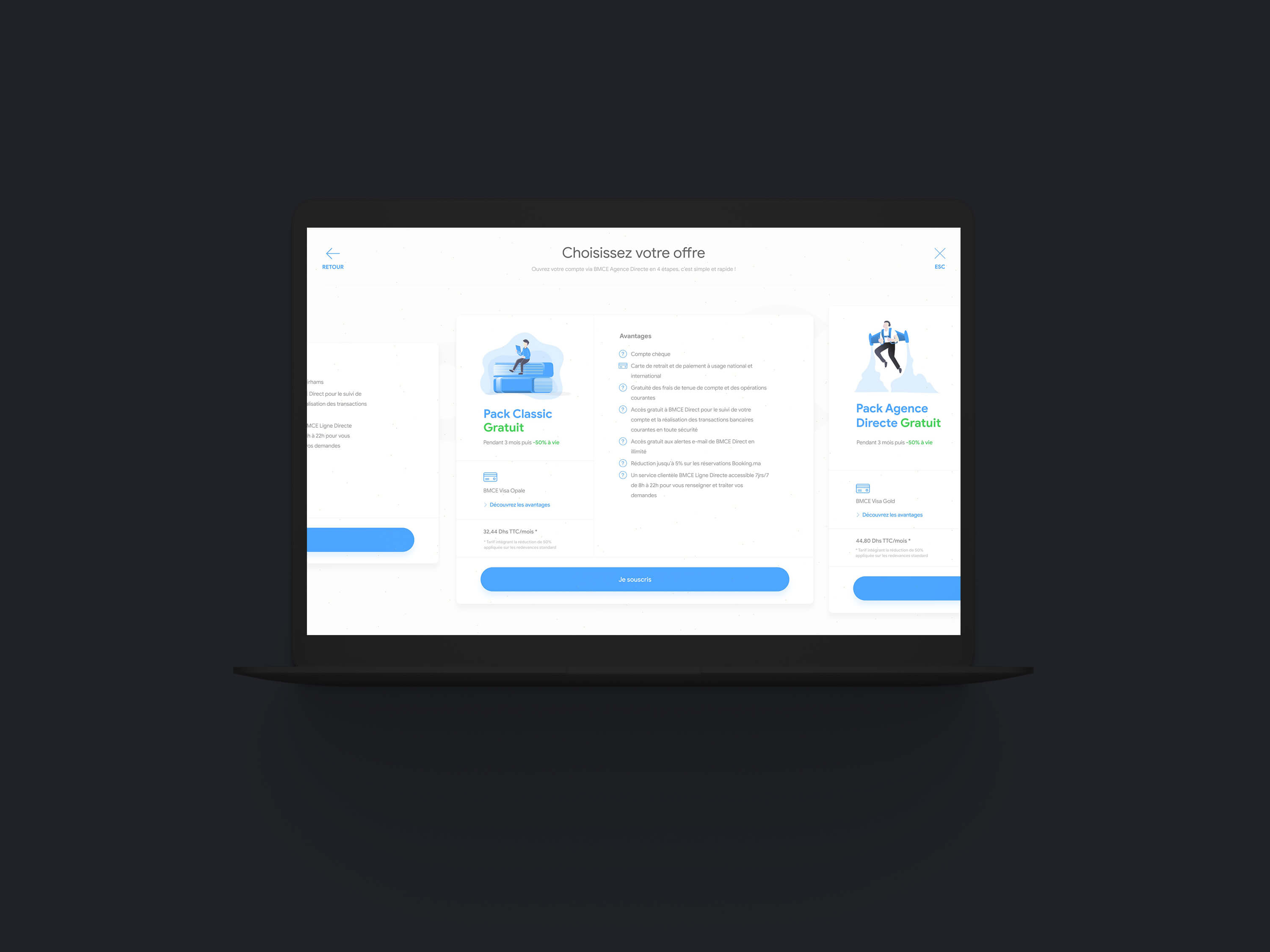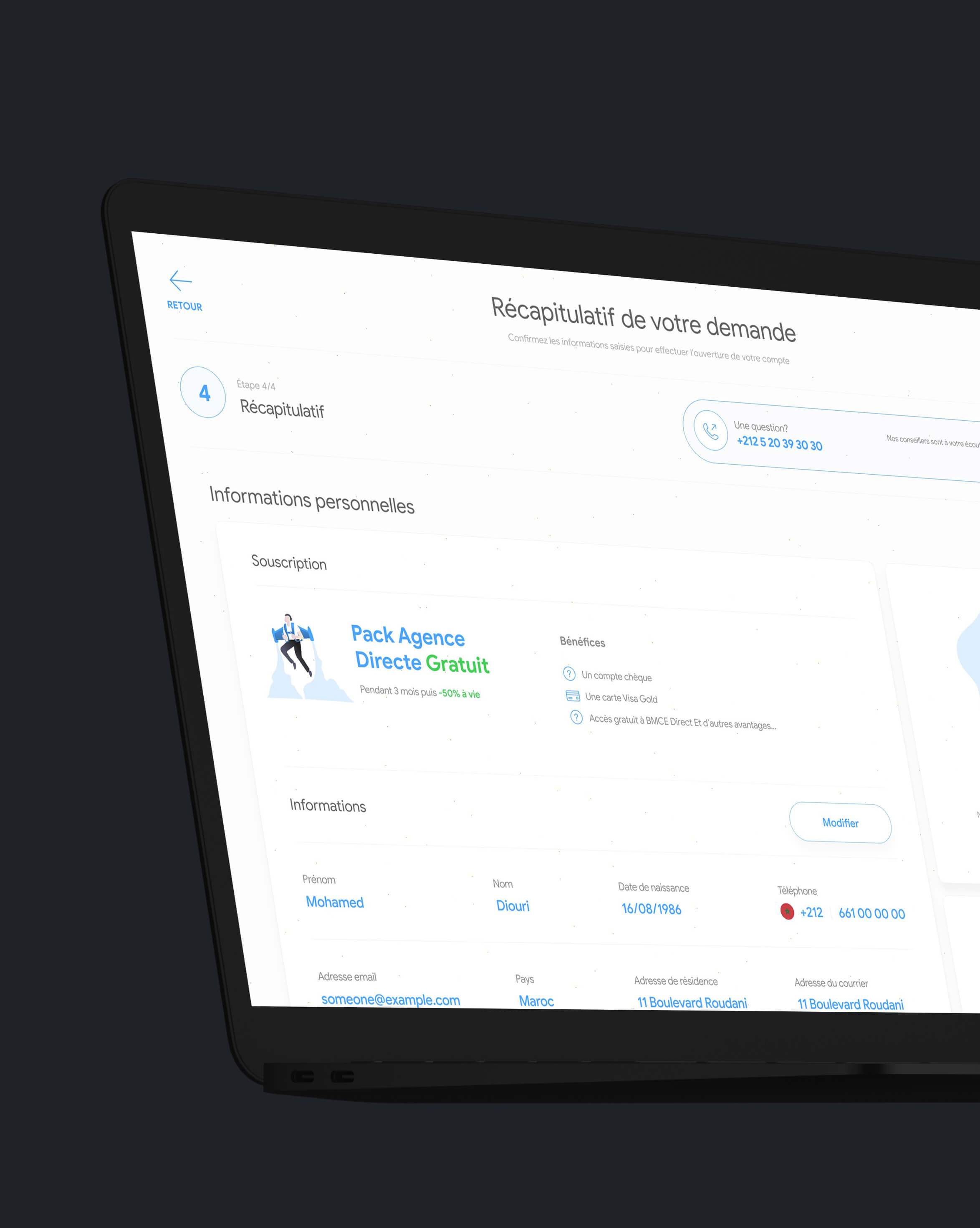 La plateforme embarque un Design System assez simplifié et friendly, un choix de palette appaisant et une typeface assez moderne. La plateforme embarque aussi des technologies de sauvegarde de données durant la saisie d'informations afin de permettre une meilleure experience utilisateur. L'utilisateur peux à tout moment poursuivre sa création de compte. voir le prototype