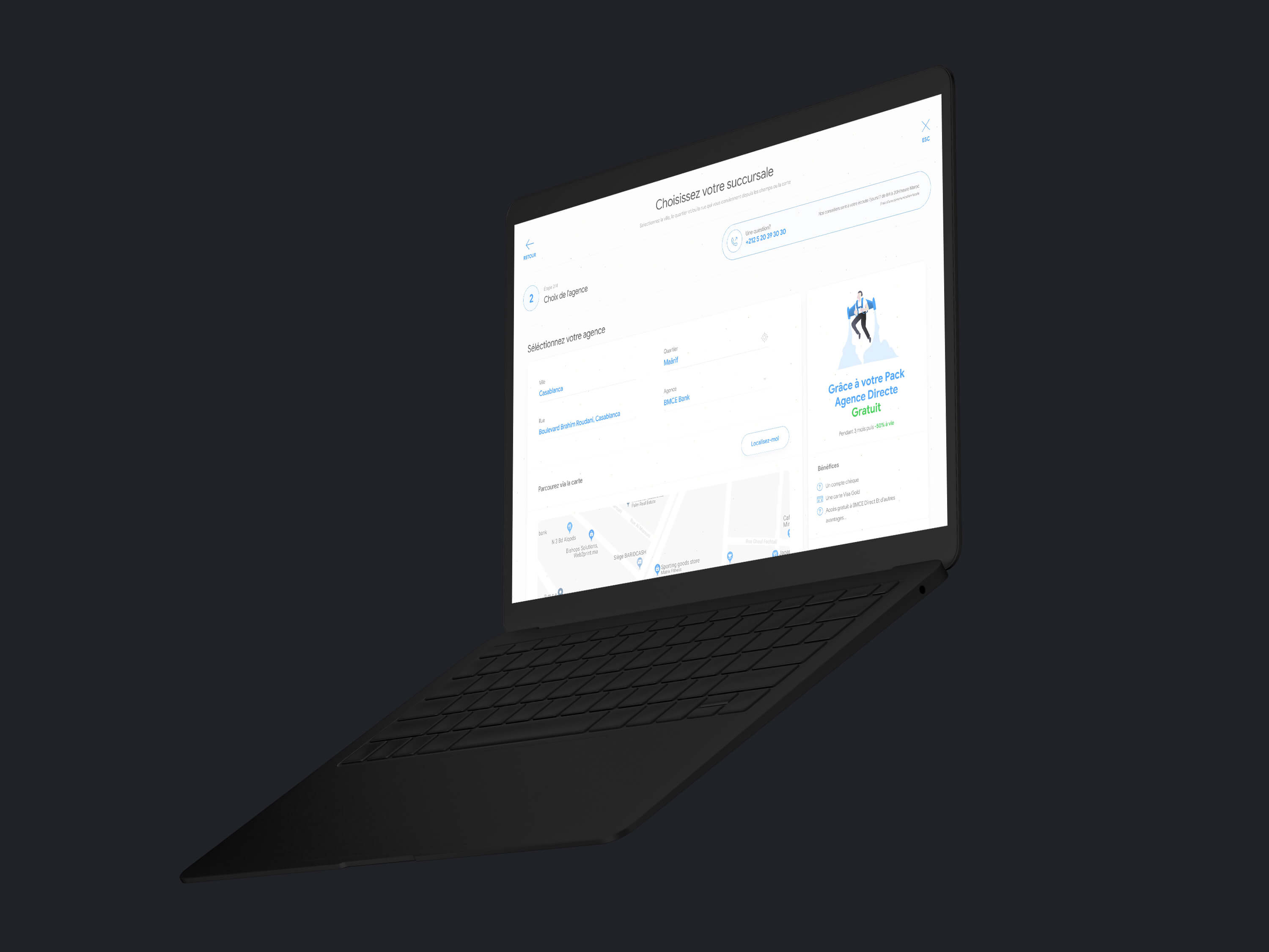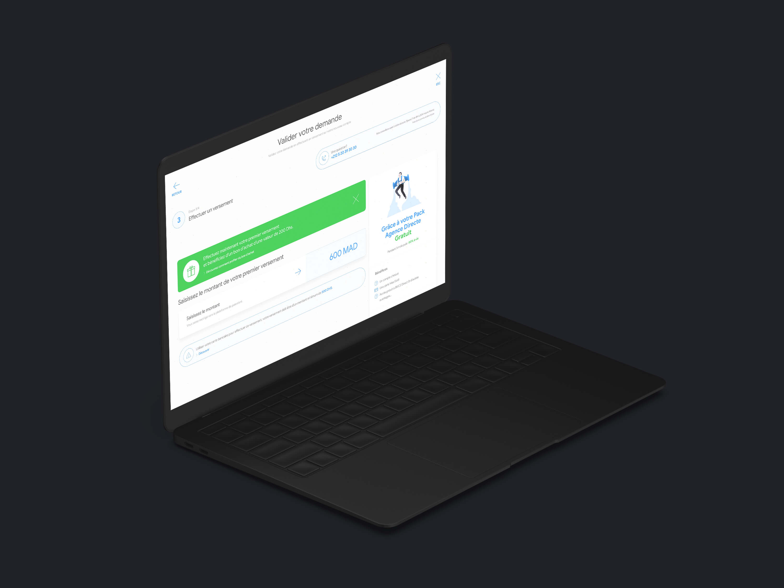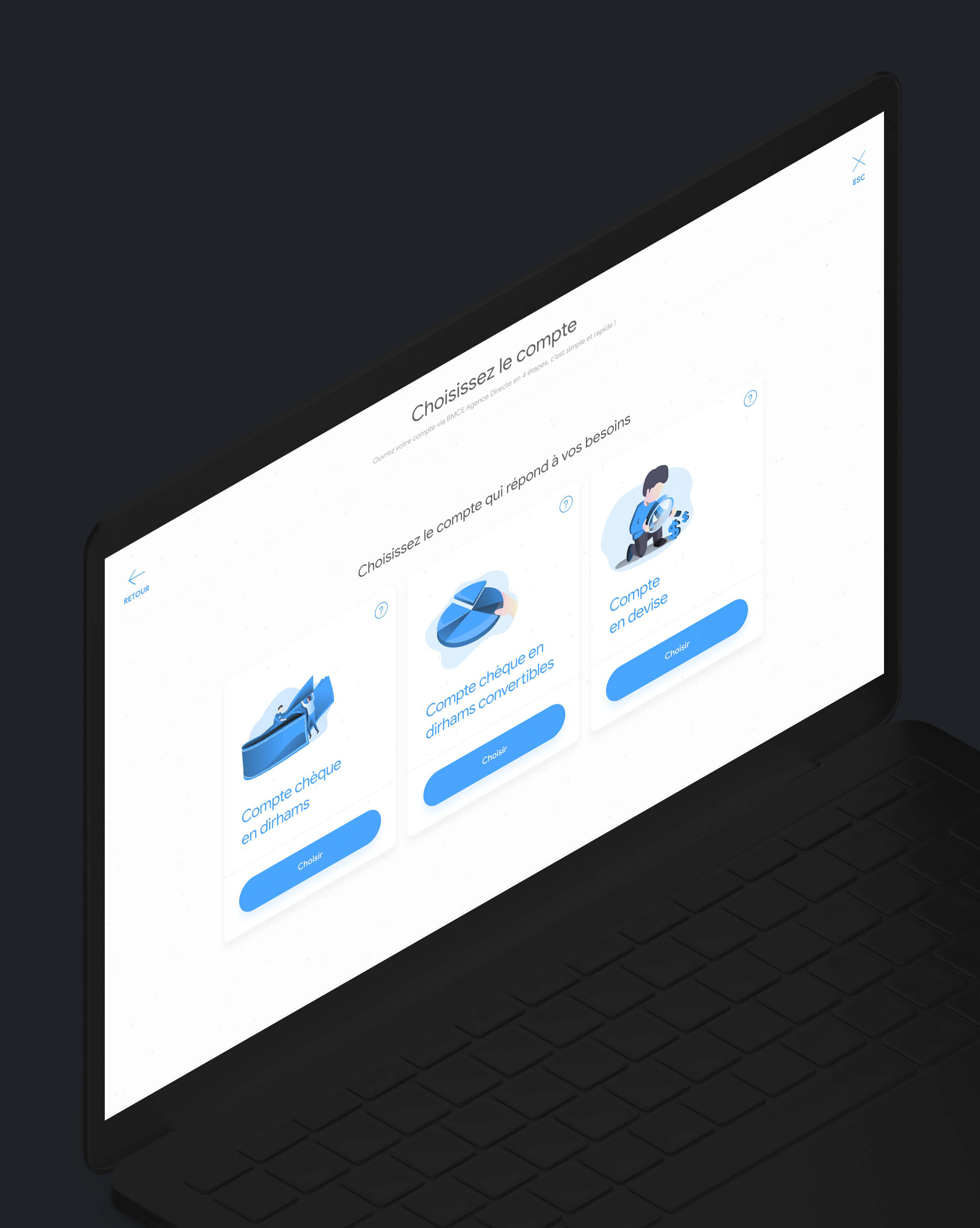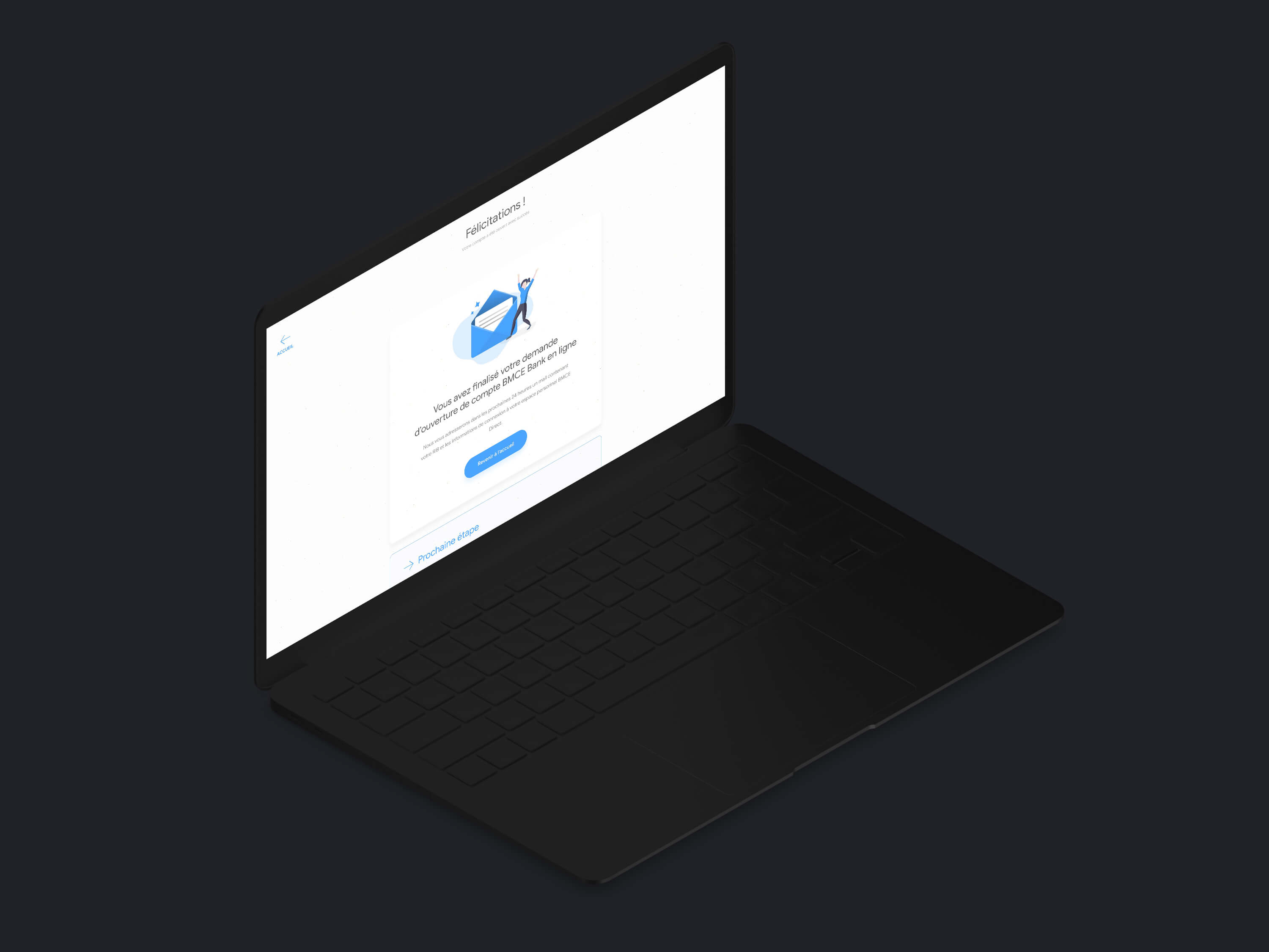 La plateforme embarque un Design System assez simplifié et friendly, un choix de palette appaisant et une typeface assez moderne. La plateforme embarque aussi des technologies de sauvegarde de données durant la saisie d'informations afin de permettre une meilleure experience utilisateur. L'utilisateur peux à tout moment poursuivre sa création de compte. voir le prototype